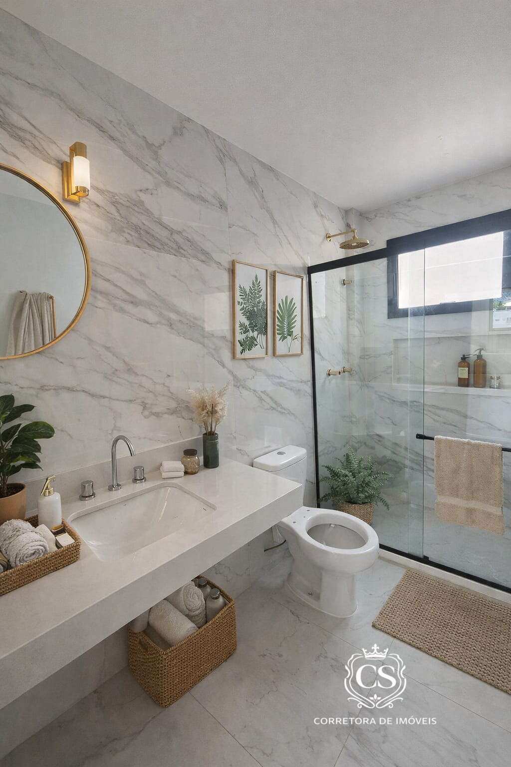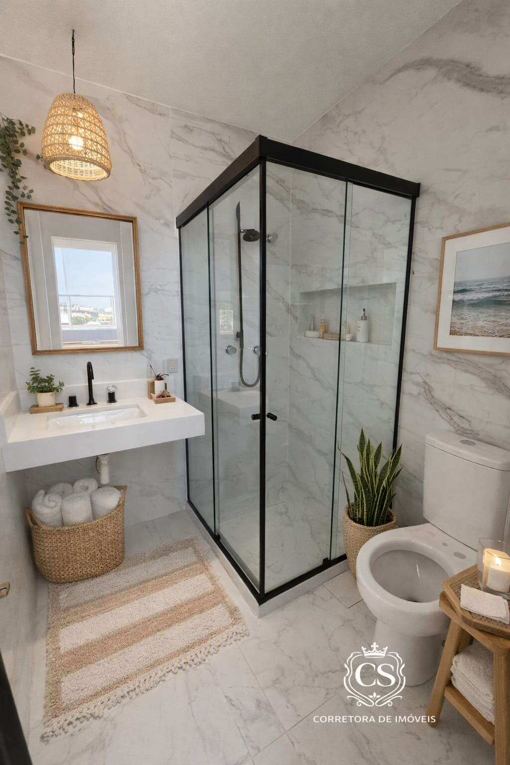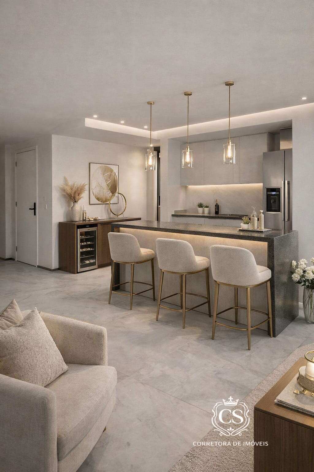 1º pavimento: ampla varanda confortável, sala em 2 ambientes integrada à cozinha americana, lavanderia, 3 quartos sendo 2 suítes e banheiro social.
